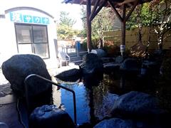 露天風呂。 ここも狭かったなぁ。浴槽が5つ。壺湯が2つ。 建物の屋根が張りだしていて、高濃度炭酸泉と坐湯の浴槽の上にかかっている。雨の日でも頭は濡れない。